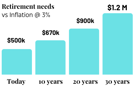 Now, let’s consider your retirement savings. You might imagine needing $500,000 for a comfortable retirement today, by the time you retire in 30 years, inflation could push that figure to nearly $1.2 million if we assume a 3% annual inflation rate.
