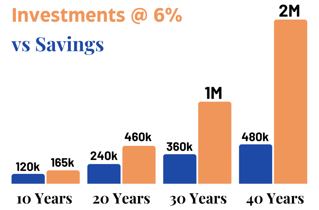 But inflation is only one side of the story. By investing your money consistently over time, you can grow your savings and outpace inflation. Let’s break it down: assume you tirelessly save up $1,000 per month for the next 40 years for your retirement at 0% interest. After 40 years, you would save $480k. Instead, if you invested the same amount of money at an average return of 6% per year, your money could have grown to around $2 million, which increases your retirement nest egg by 4 folds. That’s the power of compound growth—your investments generate returns, and those returns generate even more returns. It’s how your money works for you.